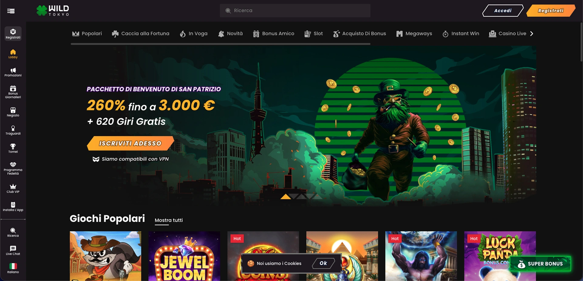 Il pacchetto di benvenuto del 260% fino a 3.000€ + 620 giri gratis posiziona Wild Tokyo tra i casino non AAMS più generosi del mercato. La piattaforma offre un catalogo impressionante di oltre 4.000 giochi, incluse le slot più popolari e un’ampia sezione di live casino.